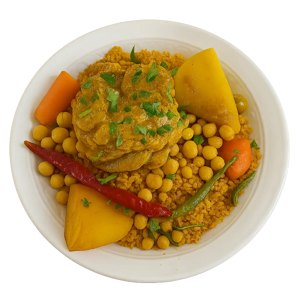 Ce plat généreux marie la tendresse d’un agneau mijoté aux épices avec la finesse de la semoule et la richesse des légumes fondants. Relevé avec justesse, chaque bouchée est un voyage au cœur des traditions familiales