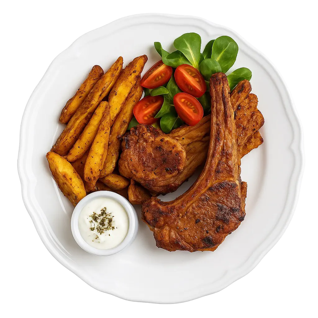 Des côtelettes d’agneau grillées à la perfection, tendres à l’intérieur et légèrement croustillantes à l’extérieur. Servies avec une salade fraîche, des frites dorées et une touche de harissa maison, ce plat incarne l’alliance parfaite entre tradition tunisienne et plaisir gourmand.